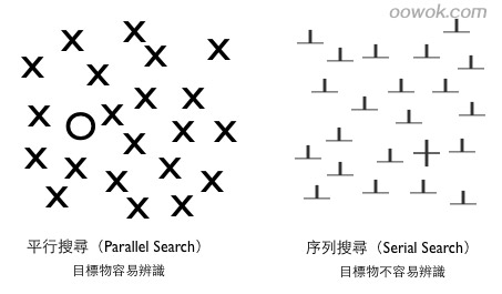 信噪比跟其實跟人類的搜尋系統(tǒng)有很大的關(guān)系,人類的視覺搜尋系統(tǒng)其實很有趣,當大量的資訊同時呈現(xiàn)在我們面前的時候,有時候我們會覺得很容易、一下子就可以找出不同的資訊,有時候我們又會覺得很困難、要花一些時間才能找出不同的地方。到底這兩種不同的差異是由什么原因所引起的呢?